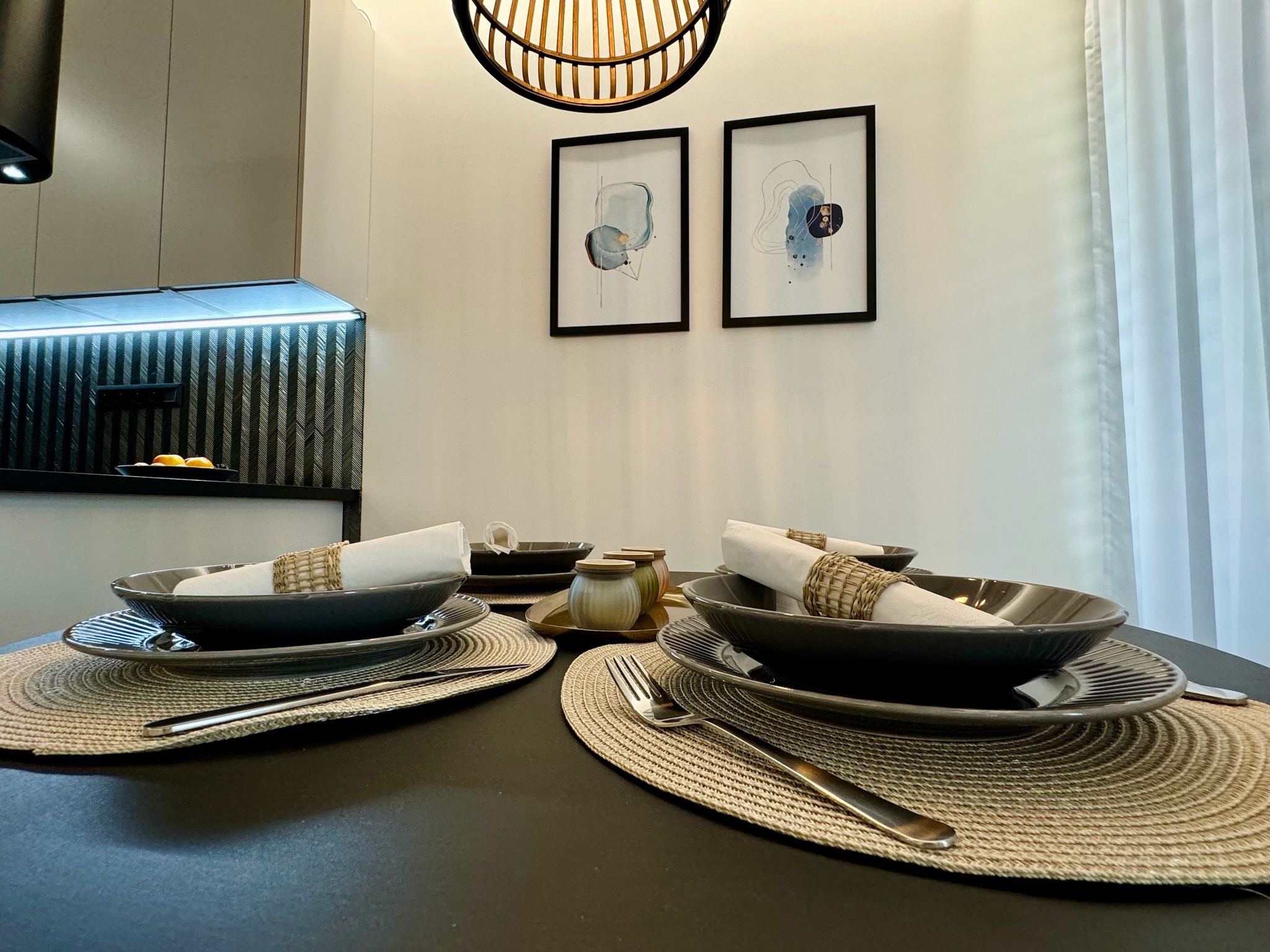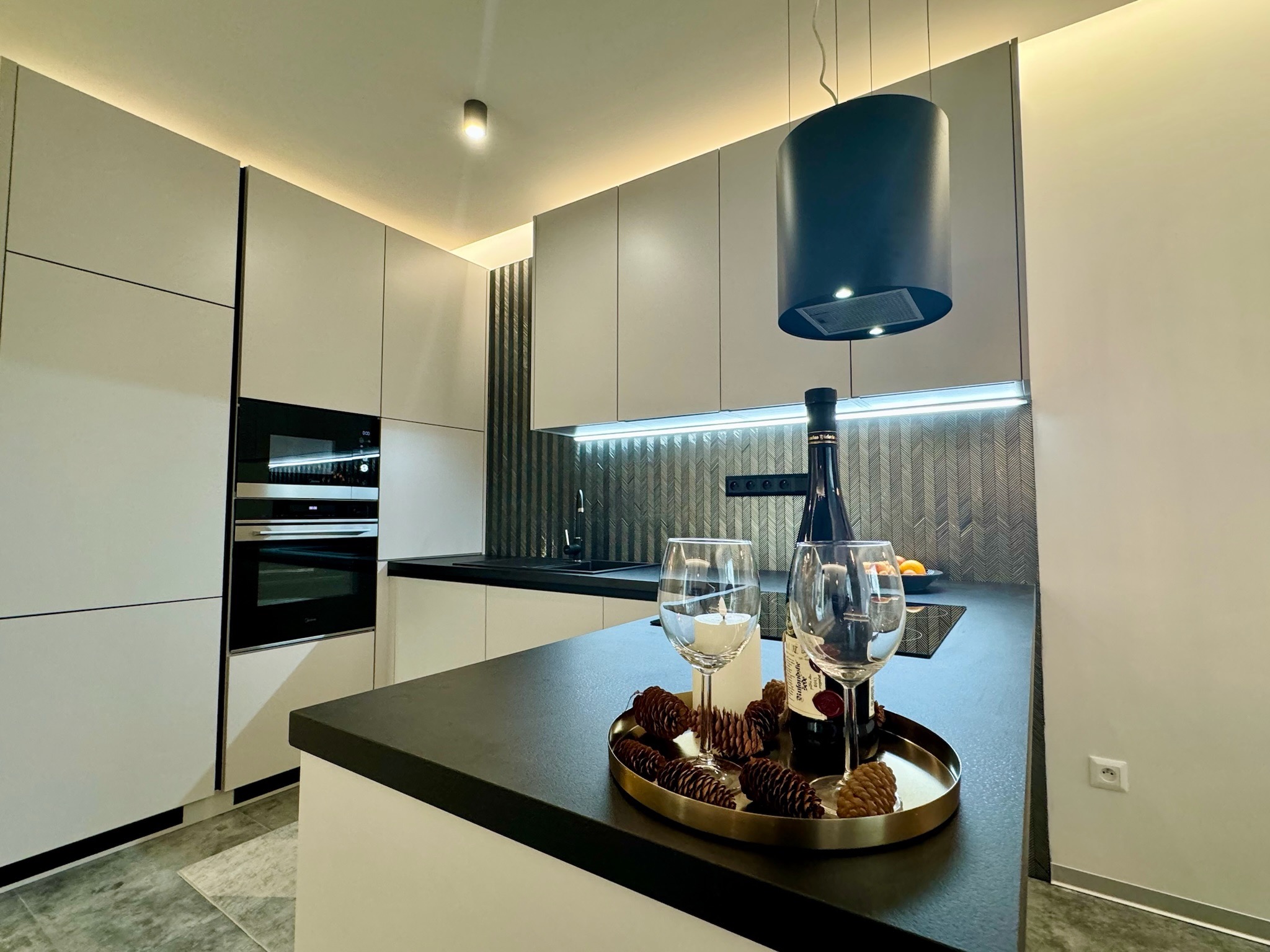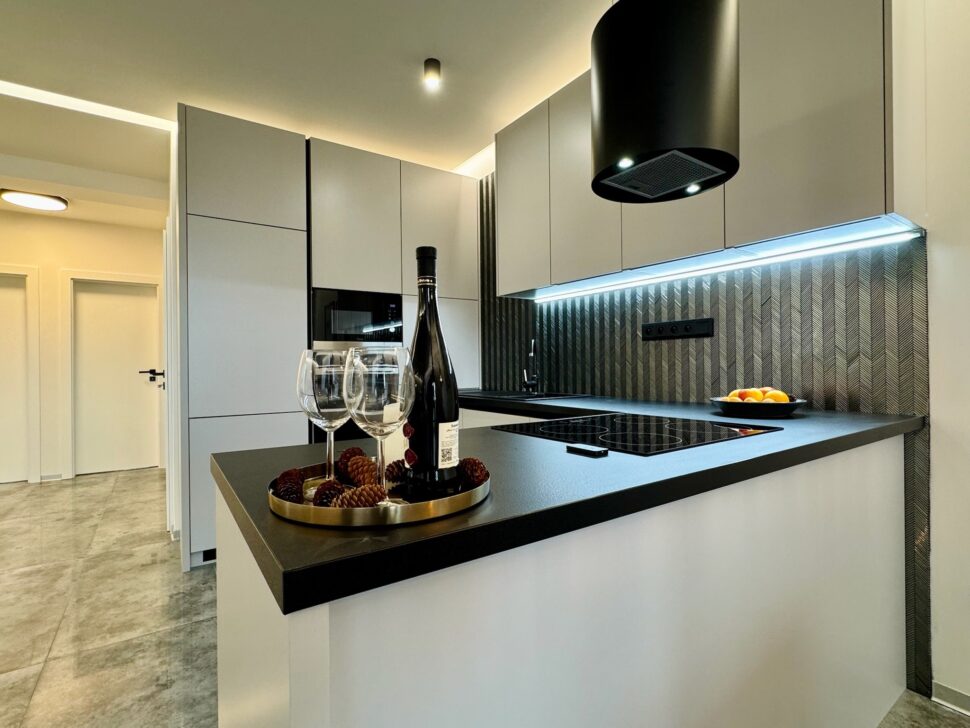 Apartmán disponuje veľkorysým otvoreným priestorom, ktorý spája obývaciu izbu, jedáleň a modernú kuchyňu vybavenú najnovšími spotrebičmi.
